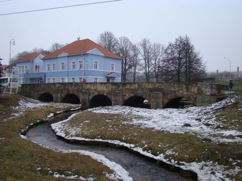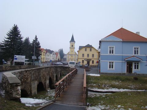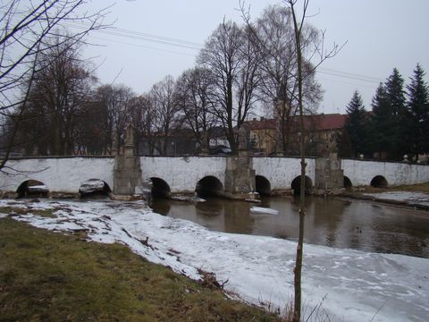 Rovnýma nohama jsme skočili do současnosti, protože Bělá (442 m n.m.) je v údolí za kopcem. Na náměstí jsme vjížděli po kamenném mostě přes Bezděkovský potok (v roce 1820 jej pro obecné dobro vystavěl baron Koc; pětiobloukový klasicistní most je mladší bratříček nedalekého slavnějšího barokního přes Radbuzu, na který jsme se těšili), vše bylo vzorně označené, kolem se chumelili turisté, ale sněhové vločky ne a ne…