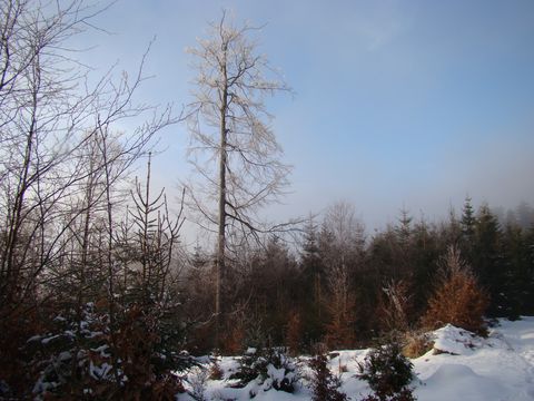 Noc na pátek 6. 2. jsme strávili v dobré třídní společnosti, snídaně ve školní jídelně byla povzbuzující, běžky odpočívaly a my jsme se vydali pěšky do kraje zaniklých obcí, vojenských silniček, do nejmladší CHKO Český les, abychom rozveselili opuštěnou přírodu svou přítomností. Místa, která byla znovu osídlena, jsou upravená a snaží se přirozeně začlenit do běhu zdejšího světa, ale přelidněno tu není. Naše trasa vedla pohraničním Haltravským hřebenem, šli jsme s přáteli Mílou a Pavlem.
