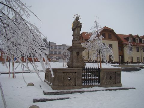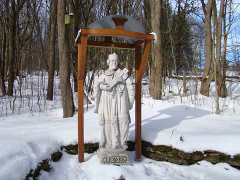 Na pohraniční hvozdy shlíží sv. Jan Nepomucký v novém žulovém provedení a označuje cestu, která vede do kopce na znovu vysvěcený hřbitov původních obyvatel.