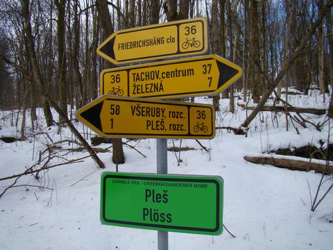 Z Bělé jsme se vydali po zelené TZ na bystřické rozcestí a potom po náhradním značení jsme vystoupali na hřebenovou cestu, která nás postupně zavedla k několika zaniklým obcím. Jsou označeny zelenými dvojjazyčnými cedulemi a je zvláštní sledovat, jak jsou zbytky základů prastarých statků prorůstány stromy a křovím a milosrdně se tak zacelují rány… Vojáci domy po odsunu německých obyvatel rozbořili, protože nepotřebovali na západní hranici žádné objekty, kde by se mohli „narušitelé“ schovávat… Během dne jsme četli názvy Růžov, Liščí Hora, Novosedly, Mostek… Hlavním lákadlem dnešní cesty byla Liščí hora, bývalý vojenský objekt, dnes romantický vršek, ze kterého prý je za příznivého počasí krásná vyhlídka. Dnes vyhlížel takto: