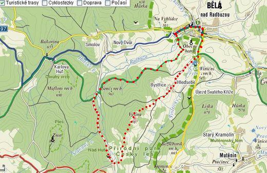 Trasa: Bělá – Bystřice – Liščí hora – Mostek – Nový Dvůr – Bělá = asi 18 km
