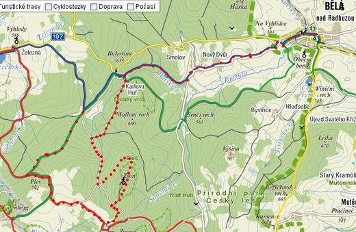 Waldorf –rozcestí pod Pleší – Náměstí přírody – Pleš – Velký Zvon – Kocovy kameny – Karlova Huť – Smolov – Nový Dvůr – Bělá = asi 25 km