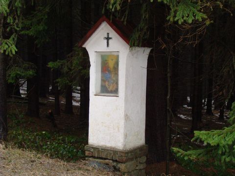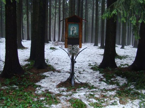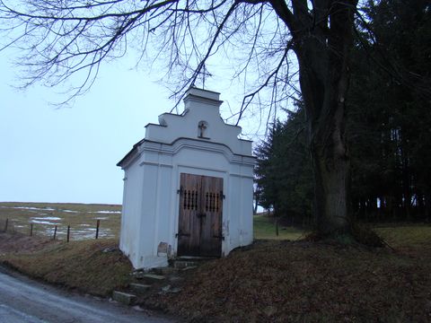 Osm kilometrů po zelené značce bylo ve znamení několika mírných stoupání a klesání, obtíží s protivětrem a mokrým sněhem, ale vše v takové míře, že jsme si při batolení po rodné Vysočině zachovali dobrou a rozmarnou náladu. Pak jsme uviděli na 645 metrů vysokém Řehořovském kopci svítit bílou kapličku, na jeho úbočí chalupy mé rodné obce a byli jsme v cíli dnešní cesty.
