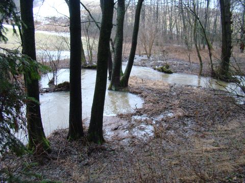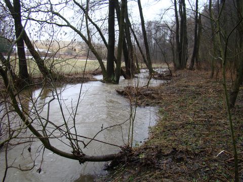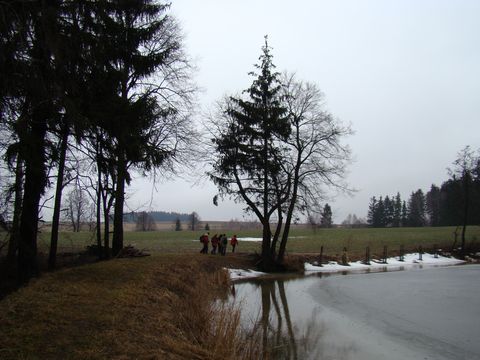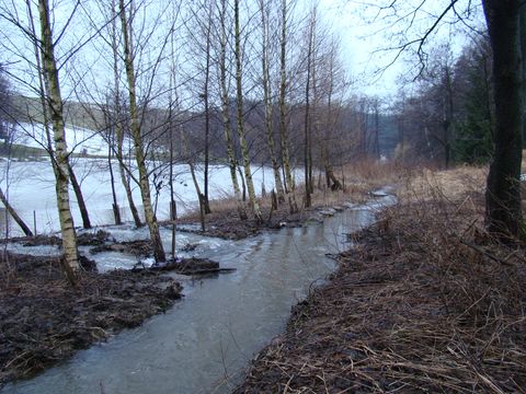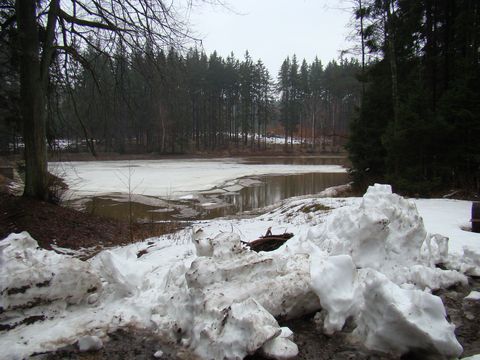 Ochozský potok vytvořil hluboké údolí, dlouhé asi 5 km – okolní svahy, v letošní zimě plné sněhu, už se svého bílého kabátku zbavovaly a voda stékala do potoka, ten se statečně snažil vydržet nápor a zatím se mu to docela dařilo; přáli jsme obyvatelům Polné, aby letošní jarní vody byly pro ně jen romantické podívání… Ostatně Ochozský potok není na zvládnutí situace sám – podél něj je v údolí šest rybníků, které zachycují vodu z okolních šestisetmetrových lesnatých svahů – proti proudu to jsou rybníky: Podhorský, Podleský, Panák, Čihadlo, Dolní Ochoz a Horní Ochoz. Stezka vedla místy dosti mokrým terénem, místy jsme překračovali či všelijak legračně přelézali a přeskakovali, baletně se nadnášeli a neohrabaně tlápali přes drobnější či příležitostné potůčky, což bylo zdrojem veselí – mokré byly naštěstí jen pohorky…