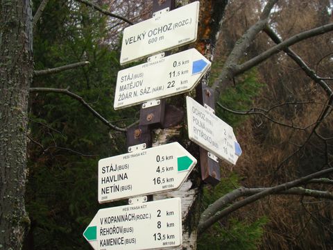 Asi kilometr za Ochozským rybníkem jsme opustili údolí, nedaleko odtud, ve Žlabech u obce Stáj, kousek od evropského rozvodí Labe-Dunaj, pramení Ochozský potok. Stoupali jsme, v lesích bylo ještě hodně mokrého těžkého sněhu, chůze v něm nebyla snadná. Těmto lesům se říká – jak jinak než Ochozské, a prý v nich tábořilo za napoleonských válek francouzské vojsko. Teď tu nebyl cítit střelný prach z mušket, intenzivně jsme vnímali vůni přicházejícího jara, ačkoliv jsme cupali vrstvou rozbředlého sněhu. Došli jsme k rozcestníku, podle něhož jsme měli polovinu cesty za sebou a přešli jsme na zeleně značenou trasu.