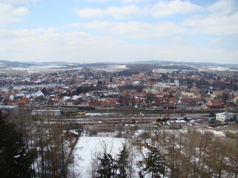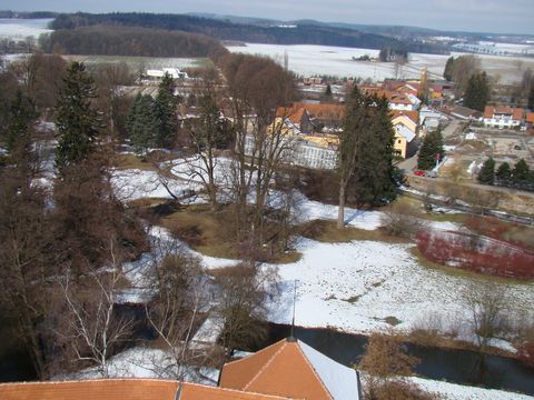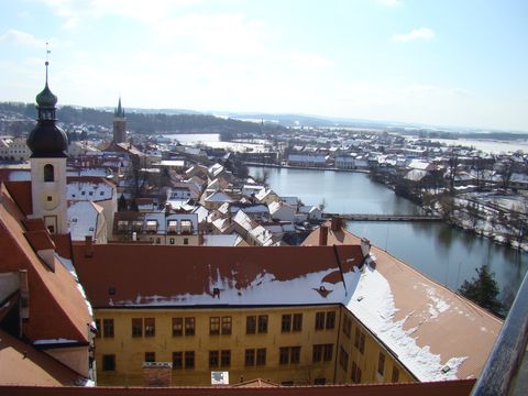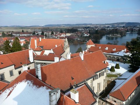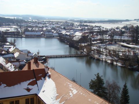 pohled z věze sv. Jakuba na zámecký komplex a Stěpnický rybník