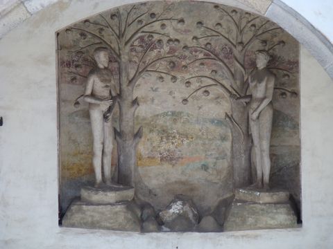 u brány do zahrady zvou Adam a Eva ke vstupu do ráje