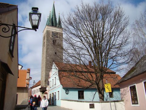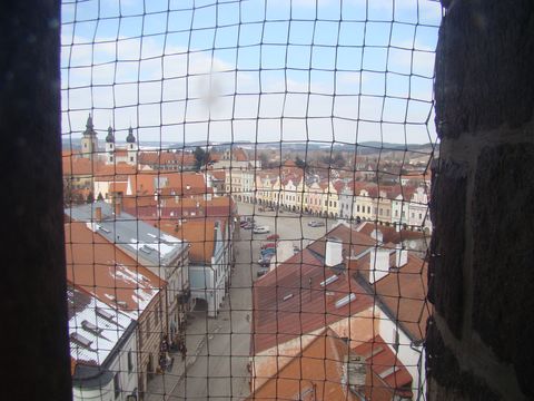 Pozdně románská věž sv. Ducha z 1. poloviny 13. století je nejstarší dochovanou stavební památkou Telče, původně byla stavěna jako věž strážná. Je vysoká 49 m a vyběhli jsme na ni lehounce, odměnou nám byl zamřížovaný pohled na náměstí.