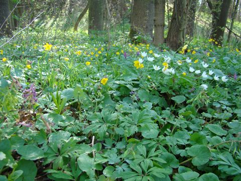 Pokračovali jsme na rozcestí k Anenskému mlýnu a odtud už jsme se začali po žluté TZ vracet okruhem do Střelic. Cesta byla opravdu svátečně pohodová, nenáročná a vycházková. Břízy svítily svěží zelení, ostatní stromy už se taky chystaly přivítat svoje mladé listí, které se dralo z plných pupenů; slunce kreslilo stíny na mechem obrostlých kmenech letitých olší. A stromy stály v záhonech jarních kytiček, v záplavě barev.