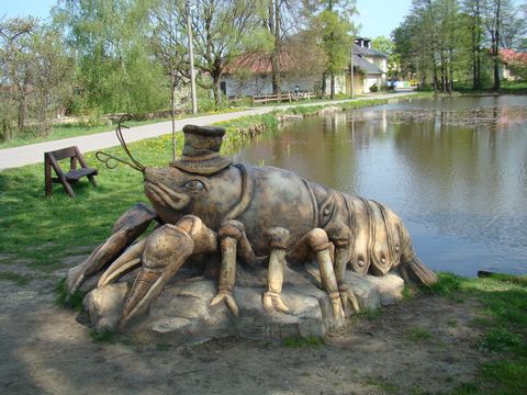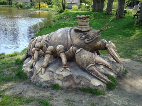 V Račíně u leknínového jezírka začala první část našeho výletu za sochami Michala Olšiaka. Před rokem jsme některé z nich na pěších výletech viděli, dneska nabízím okruh kolem všech (kromě Výra u Sykovce). Na mapce jsem označila místa jejich výskytu a našich zastávek.