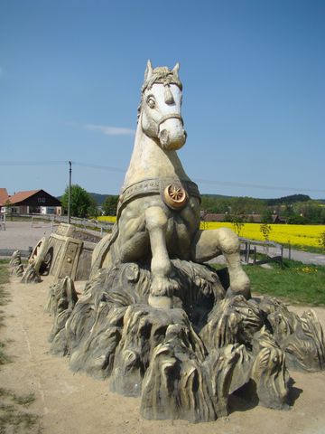 V obci Hamry je před farmou, kde chovají koně, další socha. V předchozích příspěvcích už jsou dva obrázky Koně vytahujícího vůz z bahna, proto jen pro připomínku: