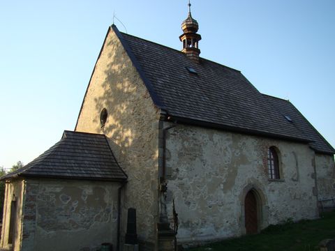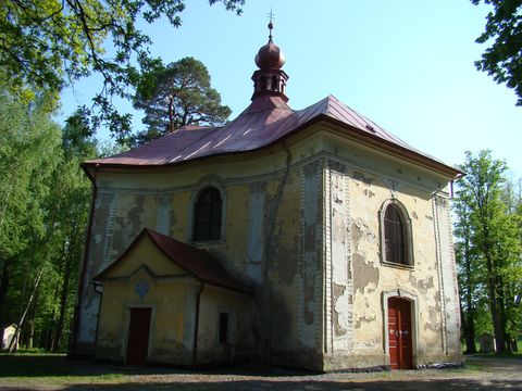 Měli jsme štěstí, kostel se opravuje a vlídní restaurátoři nám umožnili prohlídku interiéru. Ještě jsme zajeli k poutnímu areálu s kaplí sv. Anny, který je také ve jmenovaném příspěvku popsán, tady je fotka kaple ze strany od zázračné studánky.