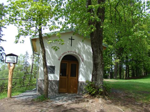 Barokní stavba je z roku 1682 a stojí na místě, kde byl z potoka vytažen kámen s otiskem šlépěje Vojtěchovy, zasazený v podlaze kapličky. Přes mříže jsme koukali s nadějí, že…, no, nevím… To Vojtěchova kamenná kazatelna naproti ve svahu se přehlédnout nedala: