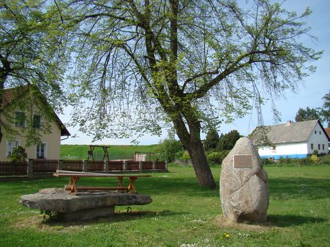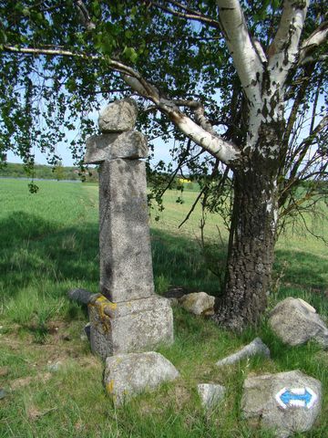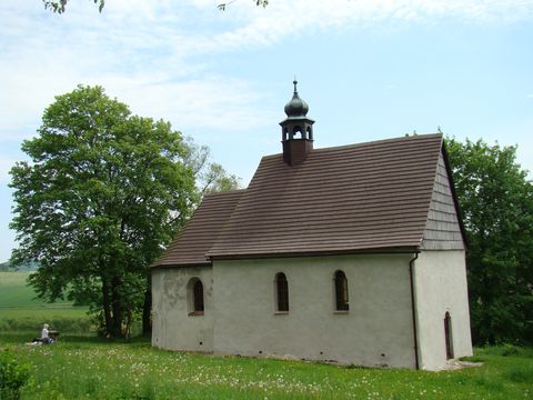 Modrá značka nás kolem dalších asi čtyřech rybníků dovedla do Újezda u Kasejovic, kde jsme se po odpočinku na travnaté návsi rozhodli sejít ze značené trasy a jít po stopách svatého Vojtěcha (957–997).