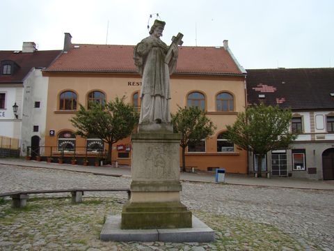 Na nepravidelném a výškově členitém náměstí vás vítá socha nejslavnějšího rodáka, sv. Jana Nepomuckého. Ještě voní novotou, protože byla odhalena v roce 1993 při příleřitosti 600. výročí jeho umučení.