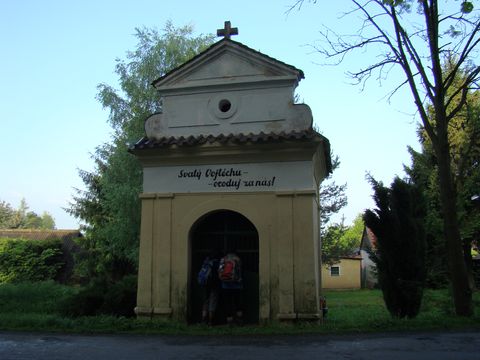 Ten tu nalezl útočiště před zloději, kdysi socha stávala v kapličce zvané Šlépěje, z ní byla ukradena, ale později se naštěstí našla. Po MTZ jsme došli na náměstí k rozcestníku a odtud jsme se vydali po ČTZ k výše jmenované kapličce.