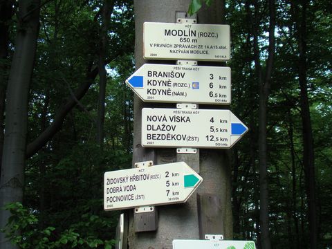 Byla to cesta vpravdě zážitková, nevím, proč se první vesnice, kterou jsme procházeli po výstupu na hřeben, jmenovala Nevděk – my jsme s povděkem přijímali, co jarně rozkvetlá příroda nabízela, výhledy na Chudenickou vrchovinu s Bolfánkem byly kalendářově krásné. Po pár kilometrech jsme došli na Modlín, kde nás vítal obrázek sv. Václava na stromě a na rozcestníku žlutá mušle v modrém poli…