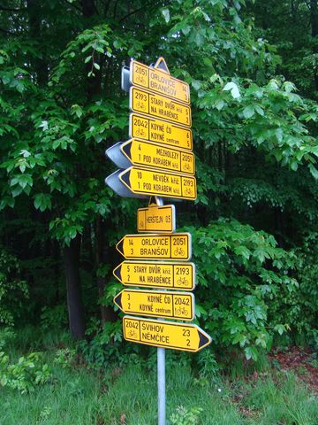 Po ZTZ jsme šli 2 km k chatě a rozhledně Koráb (773 m n.m., dřevěná postavena v roce 1938, nová v roce 1992). Pro mlhu nebylo nikam vidět, přesto nás ale zamrzela řeč správce chaty KČT, že je pondělí a kvůli nám vstávat nebude… Seběhli jsme dolů a na křižovatce byla přímo informační exploze. Nejen značky pro pěší, ale i cyklisté se odtud mohou vydat až na konec světa…