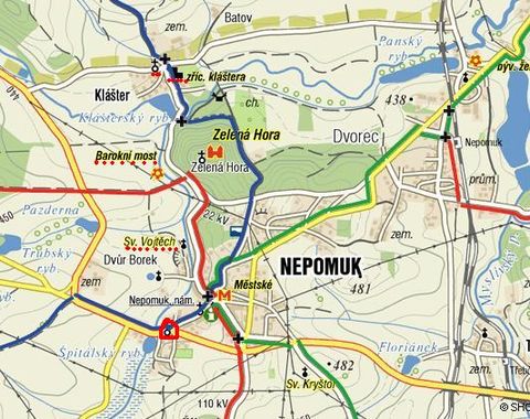 Od doby Vojtěchova pobytu (992) se jmenuje zdejší 536 metrů vysoká hora Zelená, původně byla Suchá, světec zařídil déšť, hora pomokla a ves pod ní tehdy dostala jméno Pomuk… Na Zelené hoře stával už v 10. století kostelík Panny Marie, pod kopcem vznikl v roce 1144 rozsáhlý a bohatý klášter cisterciáků, na kopci asi na začátku 13. století hrad, pak Šternberky přestavěn na zámek. Zámek Zelená Hora je nyní nepřístupný, v dějinách se dvakrát „proslavil“ – poprvé, když v roce 1817 zde byl nalezen Rukopis zelenohorský (o Václavu Hankovi jsem se zmiňovala v příspěvku z 06/2008), podruhé, když se po válce stal sídlem „černých baronů“.