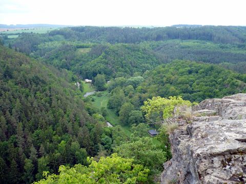 Vlakem jsme po přestupu ve Třebíči dojeli kolem půl desáté do Rapotic, vydali jsme se po silnici ke Ketkovicím, kde jsme potkali ČTZ a ta nás zakrátko dovedla na vyhlídku Panorama. Vyhlídka už je trochu zarostlá, zato ale les krásně voněl a souputníci byli skvělí, takže pohoda. Na Levnov, čili Ketkovický hrad, vede cesta vzhůru lesem, občas se poštěstí výhled do hlubokého údolí, ale to je jen reklamní trik přírody – teprve až usednete na otevřenou skálu a pohlédnete dolů, zatají se vám z té krásy dech. A skoro nevadí, že poprchává, že je vítr, že je zima…