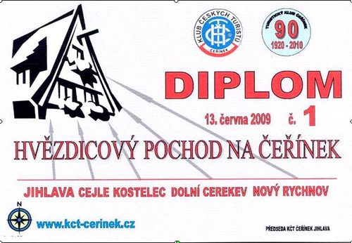 Když se člověk něčeho zúčastňuje poprvé či jede do neznáma, má v sobě očekávání a těší se, má jistotu nejistoty. Když sám aktivně připravuje takovou akci pro ostatní, všechny pocity jsou znásobeny, ano, i negativní se vloudí… Minulý rok touto dobou jsme se s Věrou a Jirkou Veselými domluvili, že existuje řada dobrých důvodů (z nichž jeden každý by stačil), proč zvát lidi na Čeřínek a začali jsme připravovat výše uvedený zábavně-turistický pobyt na kultovním místě našeho odboru KČT. Návrhy pochodnického diplomu a razítka, které nesmějí chybět a jsou skalními turisty vyhledávané a ceněné, jsou dílem člena našeho odboru Ing. Jendy Krejčího.