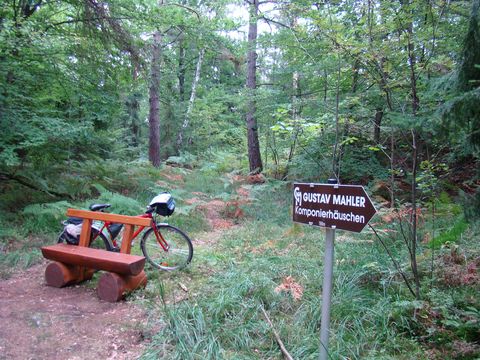 Na kole jsme zrána jeli z ubytovny asi tři a půl kilometru do Maierniggu, což je místní část Klagenfurtu a tam už jsme viděli upoutávku na cestu ke Komponierhäuschen (k Domečku) na zalesněném kopci nad jezerem. Sesedli jsme a šli pěšky vzhůru cestou, kudy chodil šéfdirigent Dvorní opery ve Vídni v letech 1900 až 1907 každý den o letních prázdninách do své lesní pracovny. Jistě měl hlavu plnou tónů, v posledních letech pak i těžkostí, které mu život připravil, přesto však určitě vnímal les a okolní prostředí. Pocházel z Vysočiny, patnáct prvních let prožil v Jihlavě a ať byl potom kdekoli, podvědomě hledal krajinu dětství. Cestu jsme pomalu prošli a tvrdím, že kdyby mě do této lokality naslepo zavedli, rozvázali oči a chtěli určit místo, řekla bych: Vysoký kámen či Čeřínek na Vysočině!
