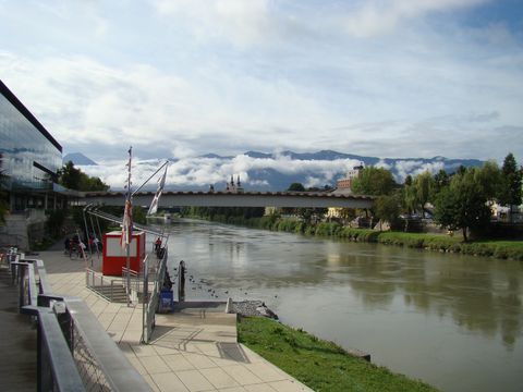 Po jídle jsme si prohlídli večerní město a pro regeneraci dopřáli nohám pár kilometrů pěších, protože v pátek 14. srpna nás čekala trasa Villach – Klagenfurt, tedy Drávská cyklostezka, značená R1. V noci pršelo a ráno bylo kalné, pohled z okna ubytovny nebyl žádná sláva.