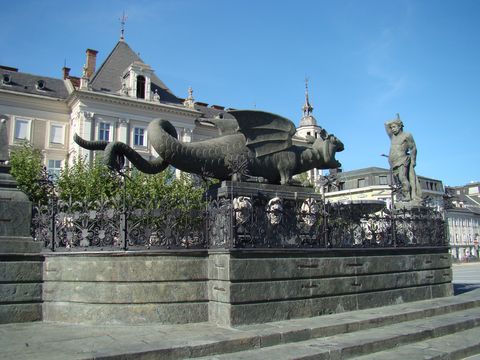 Na Starém náměstí v hlavním korutanském městě bylo přívětivě a klidno, nenadálý rozruch způsobila narušitelská skupinka mladých lidí v krojích, kteří přijeli na slámě ve vlečce traktoru, zpívali při harmonice, řidič traktoru popadl činelky a nejen my jsme se usmívali… Poslechli jsme si pár řízných písniček, pak jsme šli na Nové náměstí, na němž jsou dva významné objekty – obrovský pomník panovnice Marie Terezie (1717–1780) a centrální kašna ze 16. století v podobě kamenného draka. K němu se váže pověst, že při založení města žil v blízkých bažinách, samozřejmě požíral lidi i zvířata, nakonec byl slavně přemožen, na památku na městském znaku vyobrazen a z jednoho kusu kamene vytesán a vystaven, posléze k němu byl hrdinný Herkules s kyjem doplněn.