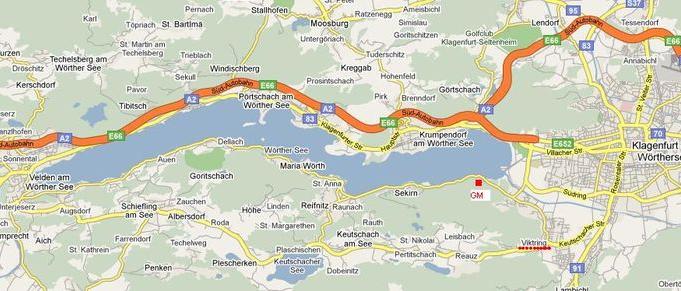 Lokalitu, kde je mini-muzeum GM jsem označila červeným čtverečkem. Cyklostezka kopíruje silnici, která lemuje břehy Wörthersee v délce asi čtyřiceti kilometrů.
