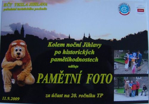 Na památku jsem dostala velký pamětní fotodiplom se siluetou noční Jihlavy a další, v jiné barevné verzi, jsem nesla jako dárek přátel-pořadatelů Mirkovi. Zpět jsem šla vlahým večerem zase pěšky, takže jsem si vlastně ten krásný diplom zasloužila.