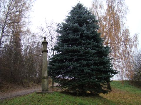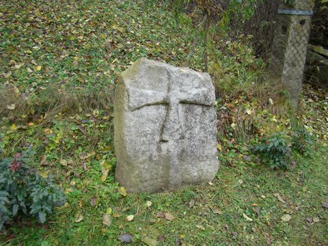 Máte dojem, že ten pamětní kámen už jste na našem blogu viděli? Ano, originál je u Zachariášovy kaple na nádvoří telčského zámku. V roce 1904 byla vytvořena kopie, která stávala u silnice, ale na začátku devadesátých let ji před nenechavci přenesli na bezpečnější místo. Pod levým ramenem kříže je meč, pod pravým tzv. biják nebo prý je to snad vařečka na památku vařečkáře, který v době prusko-rakouské války přicházel za tmy od Telče, zapaloval si dýmku a pruská hlídka měla snadný terč.