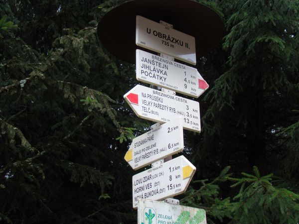 Malý ohýnek, ze kterého na fotce vidíme jen kouř, navodil přátelskou atmosféru na kus řeči s ostatními pochodníky. Podívejte se, jaké možnosti nabízí zdejší turistický rozcestník: