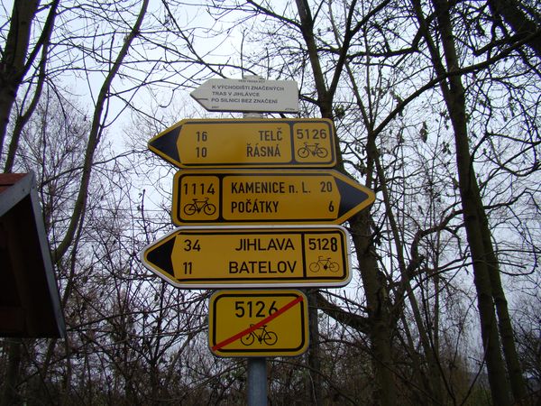 Závěr stopadesátihlavého tažení byl krátce po poledni v Jihlávce, kde je u vlakové zastávky cyklorozcestník, z něhož vyplývá přibližná informace o našem stanovišti: