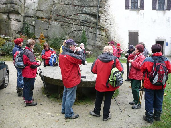Dneska nebyly výhledy daleké, ale mlhavě melancholicky sevřené, na mysl mi šly pověsti o čertu, který nedodělal dílo a vztekle házel kameny po okolí, pátravě jsem pod některým ze skalních bloků vyhlížela schovaný poklad loupeživého rytíře… Ale naší kořistí byl jen teplý čaj od pořadatelů a razítko do vandrovní knížky.