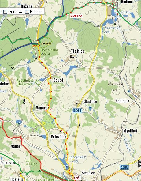 Trasa: Hodice – Kratizna – hrad Roštejn – Doupě – Volevčice – Telč = 16 km