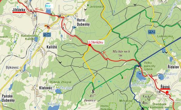 Trasa: Řásná – Velký pařezitý rybník – U obrázku – Janštejn – Horní Dubenky – Bor – Jihlávka.