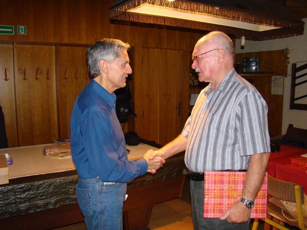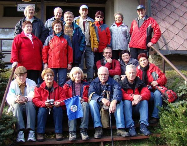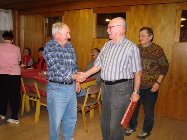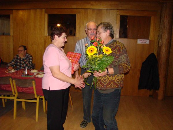 pro dnešek skončil čas práce a začal čas zábavy. Je dobrým zvykem při této příležitosti popřát zdraví a elán našim kolegům, kteří během roku oslavili kulatá životní jubilea. K tomu patří výborné jídlo a pití (důvěrně sděluji, že s pitím jsme to nepřehnali, ale zůstat neteční k dobrotám Maruščiným a Libuščiným – to vůbec nejde, a tak to byl pořádný nářez!). Zazpívali jsme si s harmonikou, kterou prozíravě přivezl sebou František Dohnal, popovídali si a opravdu jsme strávili nádherný večer ve společnosti přátel – a toho si hóódně považujeme. Manželé Dohnalovi, kteří v roce 2007 na Humpolecku zeleně vyznačili novou, 25 kilometrů dlouhou, Cestu Gustava Mahlera (od Wolkerova památníku pod Lipnicí přes rodiště hudebního skladatele a dirigenta Gustava Mahlera v Kalištích do Želiva) byli první, kterým jsme gratulovali.