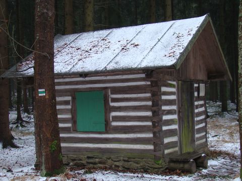 Na ní byla cedulička a z té jsem se dozvěděla, že vidíme jediný dochovaný exemplář stavby (po rekonstrukci) z doby, kdy bylo zdejší polesí v říjnu 1930 postiženo sněhovou a větrnou kalamitou a za oběť padlo mnoho hektarů statného zralého lesa. Bylo nutné odklízet polomy a následně vysazovat na holiny stromky, což nemohli stihnout jen zdejší lidé – pracovali tu i dělníci ze Slovenska a Ukrajiny a pro své blízké stavěli tyto příbytky, v nichž celé jejich rodiny bydlely přímo v místech polomů. Za čtyři roky bylo vše obnoveno a ze sazeniček jsou teď sedmdesátiletí fešáci, které obdivujeme.