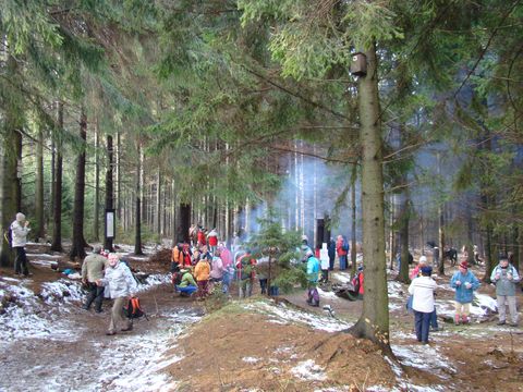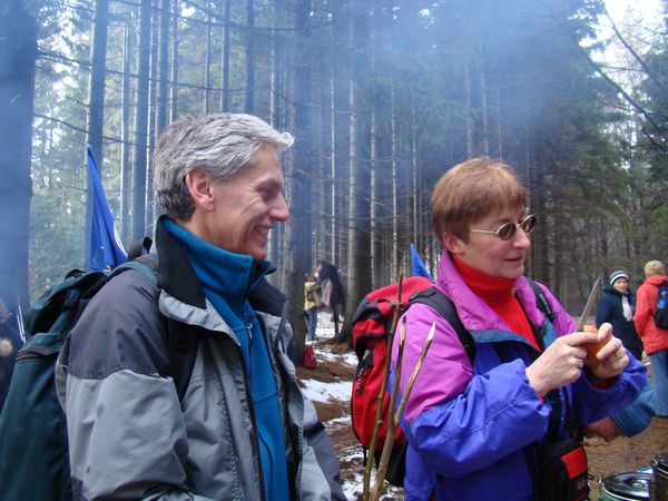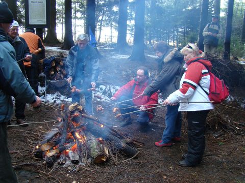 Nejdříve jsme vyřídili to, co dává této akci smysl – v rámci projektu Novoroční čtyřlístek jsme přispěli na sbírkové konto KČT, z něhož se bude pořizovat v okolí Třeboně značená turistická trasa pro vozíčkáře, a dostali jsme diplom a odznáček. Byli jsme pořadateli pěkně přivítáni (museli být úplně uzdravení) a pobídnuti k ohni. Dívat se do plamenů přes prskající špekáček je potěšení, které si málokdo nechá ujít. V bedně čekaly vonící uzenky – vezmeš si a zaplatíš do kasičky, pak rychle prokrojit a šup s tím nad oheň! Vánoční vanilkové rohlíčky a linecké hvězdičky upadly rázem do zapomnění, opečený špekáček, to je přece klasika!