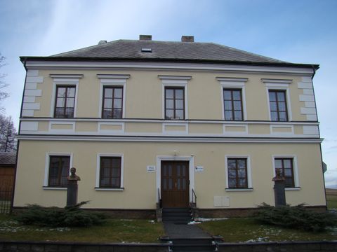 V této budově je knihovna a galerie, před ní vlevo bysta K.V. Raise a vpravo Antonína Slavíčka.