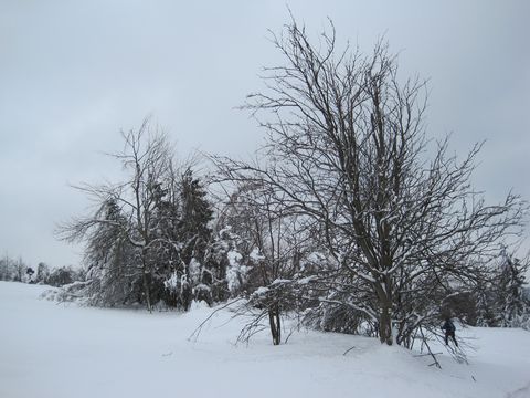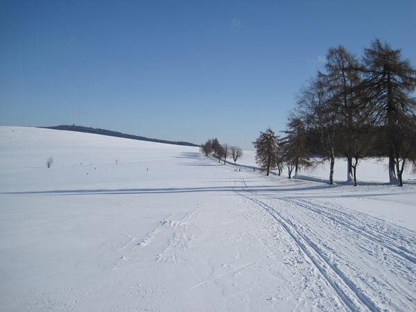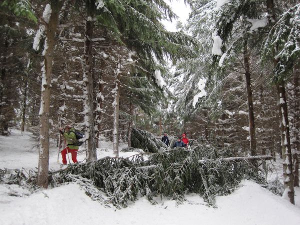 Výška snějové nadílky byla aspoň půlmetrová, v úsecích, kudy projížděla kvůli odstraňování stromů a větví padlých a spadlých pod obrovskou tíhou námrazy těžká lesní technika, byly vyryté hluboké koleje a velmi nerovný povrch byl navíc silně zledovatělý – pro moje běžkařské umění zatěžkávací zkouška a plnění bobříka odvahy i vytrvalosti.