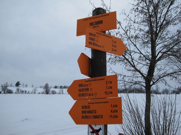 Za Kadovem jsme zvolili jinou než klasickou lyžařskou trasu a vydali jsme se přes Kadůvek po žlutě značené turistické cestě k Podmedlovskému mlýnu, stopa byla vyjetá, tak jsme se mohli kochat. Takhle vábí místní značkaři pěšáky na cestu pravou:
