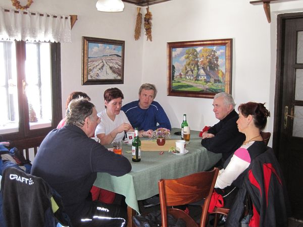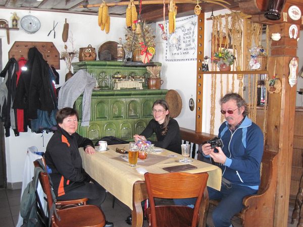Ale jak všichni víme, z okna vypadá venkovní nepohoda horší než opravdu je, a tak se tři metry bílé tmy v zorném poli postupně změnily v nižších polohách na neobvyklé stínové obrázky našich přátel tajemně mizících či vynořujících se z mlhy, která nechtěla ustoupit ze svých pozic, protože bylo bezvětří, ale tím pádem velmi příjemně. Ten pocit se umocnil při rituální zastávce v kadovské hospodě, kde nás po roce zase ovanul likérově-bylinný vánek kadovánek a vše bylo jak má být.