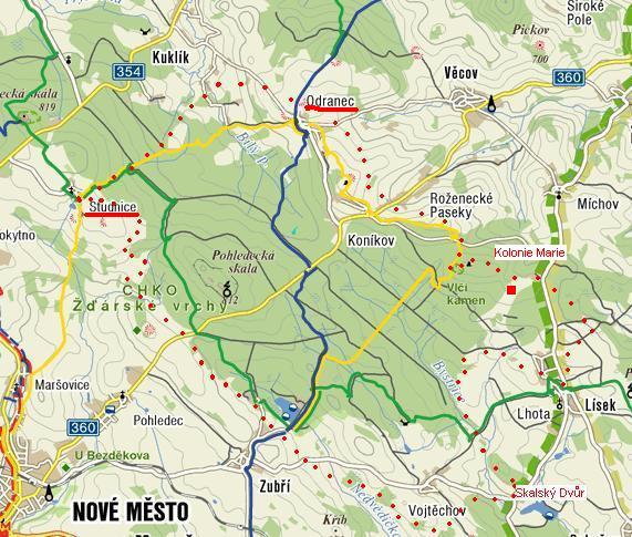 Trasa: Studnice – Odranec – Koníkov – Roženecké Paseky – u Kamenice – Kolonie Marie – Lísek – Skalský Dvůr – Nad Vojtěchovem – Pod Zubřím – Zubří BVV – Nad Pohledcem – Studnice