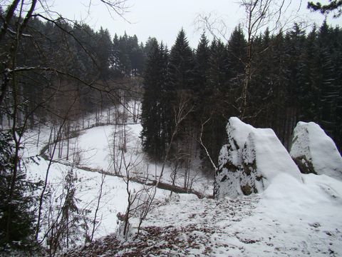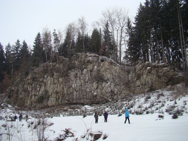 Nad údolím, kterým potok protéká, je velmi impozantní 113 metrů dlouhá, 23 metrů vysoká Bílá skála, ke které má Mirek láskyplný vztah. Je totiž rodák z blízkých Luk a jako prvňáček absolvoval svůj první školní výlet v životě právě sem… Barvitě nám všem vylíčil svoje tehdejší zážitky a výstup na skálu po mnoha letech byl dárek, který si dal právě dnes ke svátku Miroslavů – navíc poprvé zase fotil Navrátilcem…