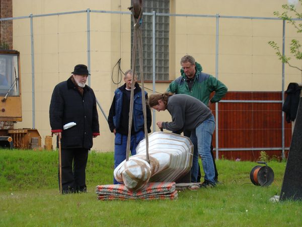 Poté, co byly vyvrtány v podstavci otvory pro kotvící čepy, připevnili sochu na rameno jeřábu a snažili se ji usadit.