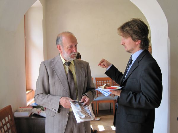 Pak jsme se přesunuli k neformální besedě do vedlejší místnosti, která zaujme příchozí svým trámovým malovaným stropem. Můžete ho obdivovat na fotce, kde si Pepa Poukar soustředěně povídá s Josefem Augustou, stříbrným olympionikem z roku 1976 a později významným hokejovým trenérem.