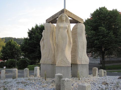 Vraťme se do současnosti… Cestou zpět jsme projížděli Štokami, kde je na novém kruhovém objezdu, který byl před nedávnem dán do provozu, nejnovější dílo havlíčkobrodského sochaře Radomíra Dvořáka, autora výtvarných děl z lipnických lomů (Brettschneiderovo ucho, Ústa pravdy a Zlatý voči). Štočtí radní si přáli mít uprostřed svého městyse něco krásného, tak pan Dvořák vytvořil tři karyatidy jakoby vystupující z pískovce. Mají ochraňovat řidiče a přát jim šťastnou cestu. Ten prostor, kdysi dost ošklivý, je teď anticky noblesní…