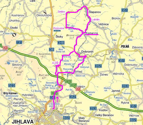 Dneska jsme ušlapali 49 kilometrů na okruhu: od Svatošů z Jihlavy – Střítež – Dobronín – Kamenná – most U Lutriána – Šlapanov – Smilov – Pozovice – Kamenná – Antonínův Důl – domů ke Svatošům