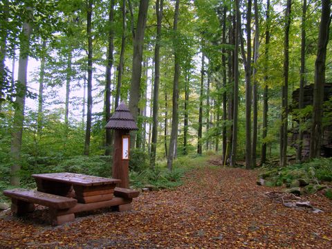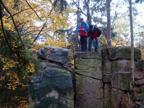 Poslední ze čtyř zdejších přírodních památek, které jsme chtěli našim kolegům ukázat, je nejvyšší bod na trase naučné stezky, Přední skála (712 metrů), prý učebnice vývoje zemského povrchu: